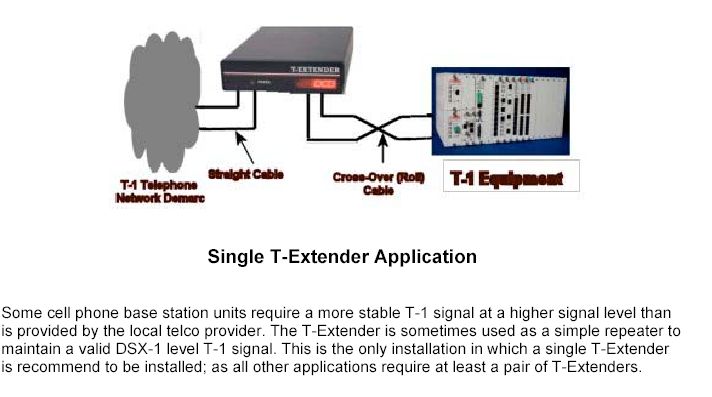 The T-Extender can be used as a simple repeater to maintain valid DSX-1 level T1 signals. This is the only application where a single T1 Extender is used. Normally these units are used in pairs to extend a T1 demarc up to 5000 feet away.